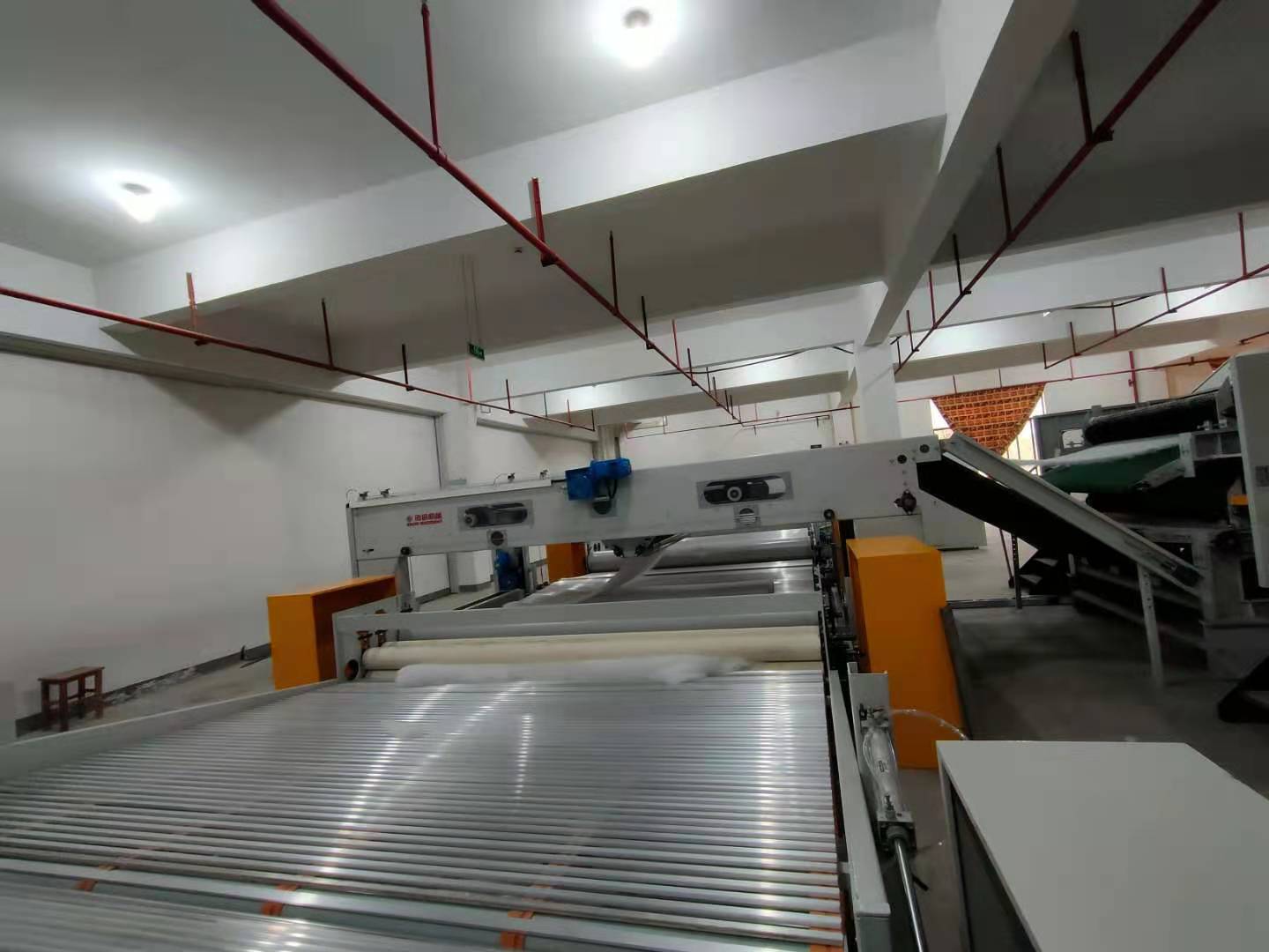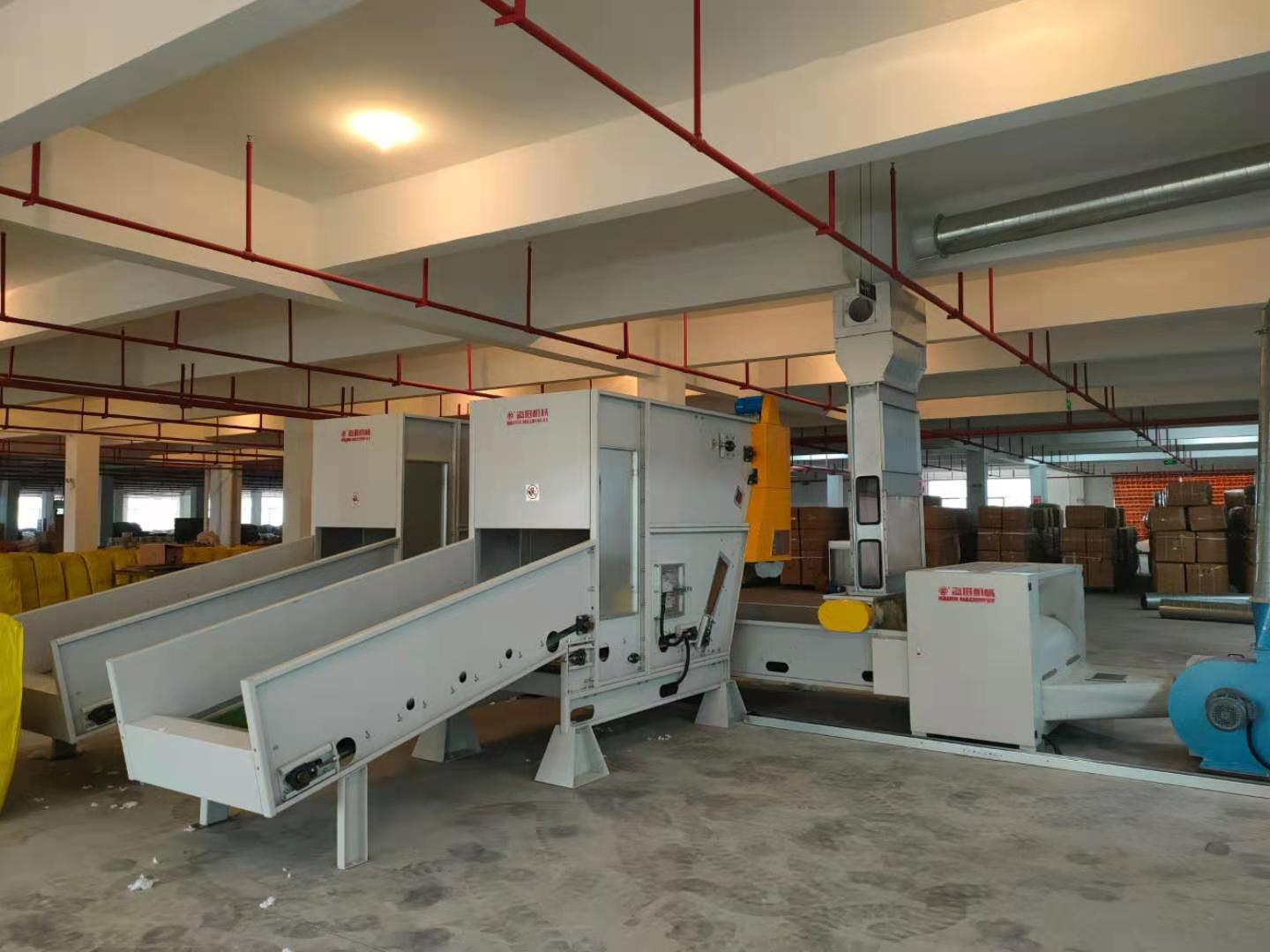 本生產(chǎn)線專為化纖填充被套的自動(dòng)化生產(chǎn)設(shè)計(jì),涵蓋從纖維梳理、填充物鋪網(wǎng)到被套封裝的全流程,具有高效、精準(zhǔn)、衛(wèi)生等特點(diǎn),適用于家紡、酒店用品、醫(yī)療寢具等領(lǐng)域的大規(guī)模生產(chǎn)。 化纖原料預(yù)處理 原料開松:將壓縮的化纖塊(如滌綸、PP棉等)通過開松機(jī)打散,形成蓬松狀態(tài)。 纖維梳理:通過高速梳理機(jī)將纖維梳理成均勻的網(wǎng)狀結(jié)構(gòu),確保填充物無結(jié)塊、厚度一致。 填充物鋪網(wǎng)與定型 交叉鋪網(wǎng)機(jī)將梳理后的纖維多層疊加,調(diào)節(jié)克重和蓬松度。 短程熱風(fēng)定型(可選):通過低溫?zé)犸L(fēng)穩(wěn)定纖維結(jié)構(gòu),增強(qiáng)回彈性。 被套裝配與封裝 自動(dòng)裁切:按預(yù)設(shè)尺寸切割填充層,匹配被套外殼。 充填裝套:通過充填機(jī)將纖維層均勻填入預(yù)制的被套外殼,避免分布不均。 絎縫/封口:采用多針絎縫機(jī)固定填充物,或通過超聲波封口機(jī)完成密封(防螨抗菌需求場(chǎng)景)。 質(zhì)檢與包裝 重量檢測(cè):確保每床被子填充量符合標(biāo)準(zhǔn)。 金屬探測(cè):排除生產(chǎn)過程中可能的金屬雜質(zhì)。 自動(dòng)折疊包裝:真空壓縮(可選)后裝箱。 高效率:全自動(dòng)化流程,日產(chǎn)量可達(dá)2000~5000床(視規(guī)格而定)。 精準(zhǔn)控制:PLC系統(tǒng)調(diào)節(jié)填充量、絎縫間距等參數(shù),誤差≤2%。 衛(wèi)生環(huán)保:封閉式填充環(huán)節(jié)減少粉塵污染,支持可回收化纖材料。 靈活適配:可快速切換不同被套尺寸(單人/雙人/加大)和填充克重。 智能分揀系統(tǒng):聯(lián)動(dòng)MES系統(tǒng)實(shí)現(xiàn)訂單批次管理。 抗菌處理模塊:在線噴涂抗菌劑(適用于醫(yī)療、兒童用品)。生產(chǎn)線概述