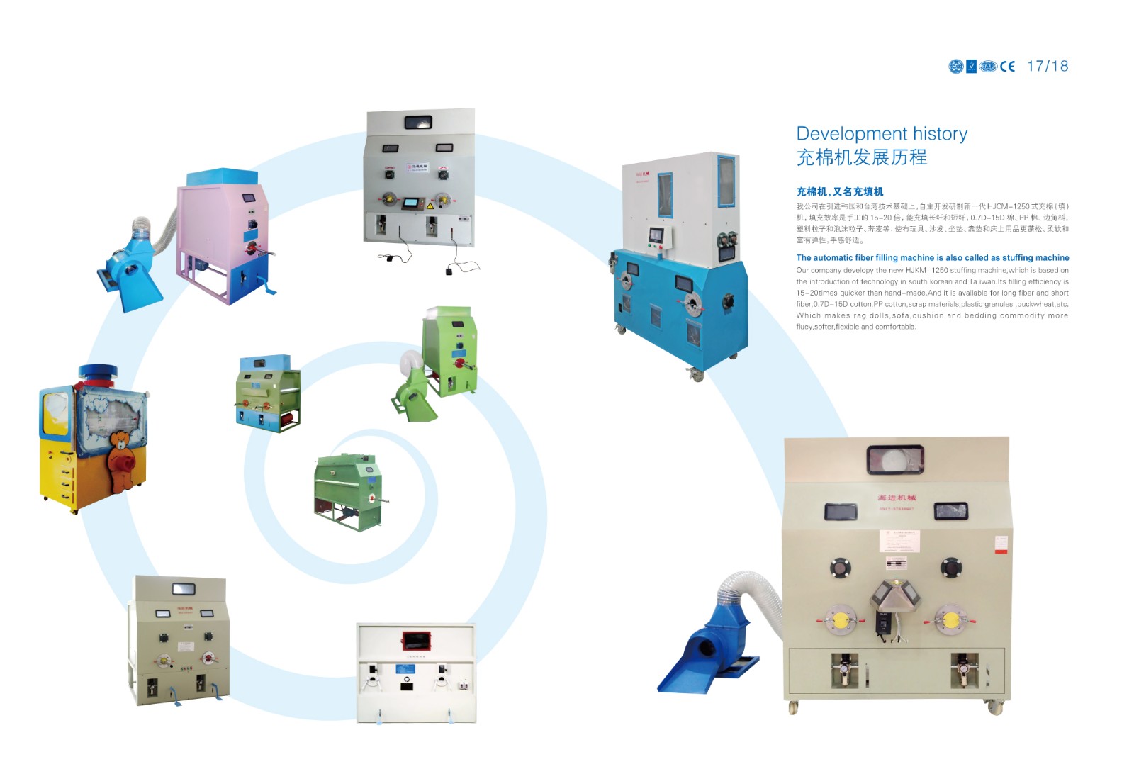 自主開發(fā)研制新一代HJCM-1250(1200)式充棉(填)機(jī),填充效率是手工的15-20倍,能充填長纖和短纖,0.7D- 15D棉、PP棉、碎海綿、邊角料、塑料粒子和泡沫粒子、喬麥等,使布玩具、沙發(fā)、坐墊、靠墊和床上用品更蓬松、柔軟和富有彈性,手感舒適。 |
